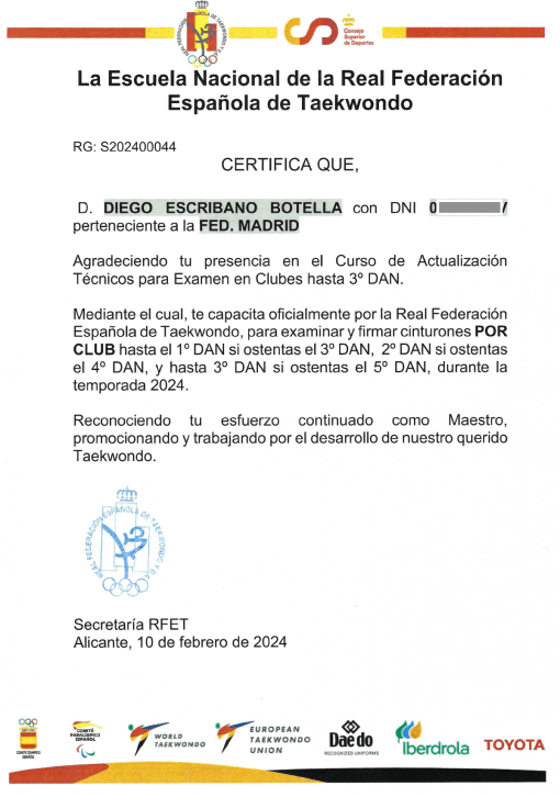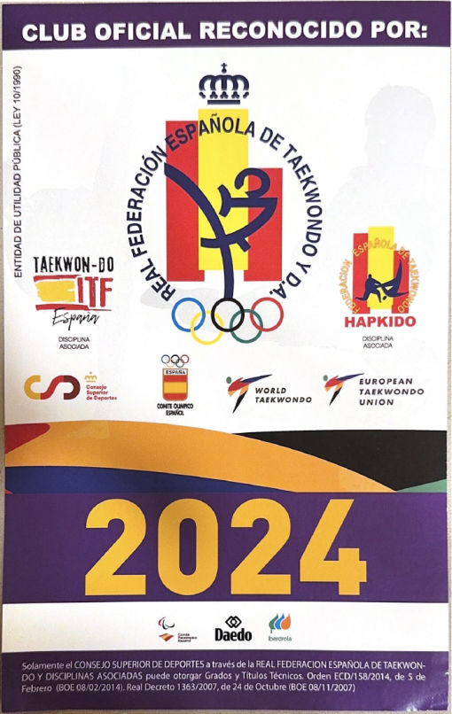 D. Fermín García, en representación de la Federación Española y Madrileña de Taekwondo en las instalaciones del Polideportivo Cerro de la Mina en Majadahonda, ha hecho entrega el día 3 de junio de 2025 de los premios conseguidos en la temporada 2024-25 por los Maestros del club